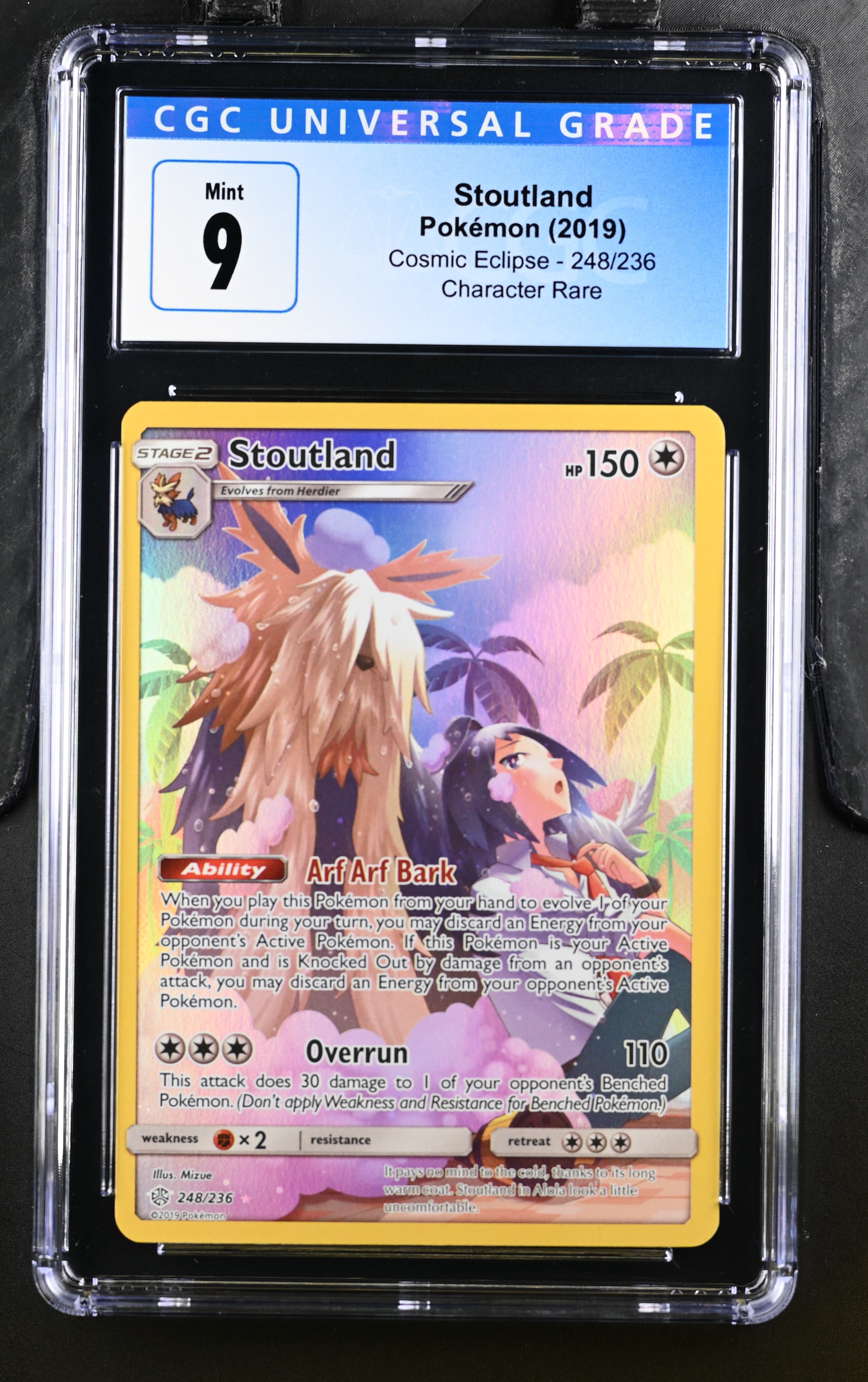 Eine wunderschöne Secret Rare "Character" Karte aus dem beliebten Set Sun & Moon: Cosmic Eclipse: Stoutland. Bewertet mit der starken Note MINT 9 von CGC.